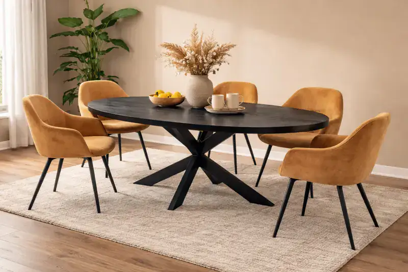 De ovale eettafel Varley ‘Zwart’, met afmetingen van 240x120x75 cm, heeft een stoer, eigentijds uiterlijk.